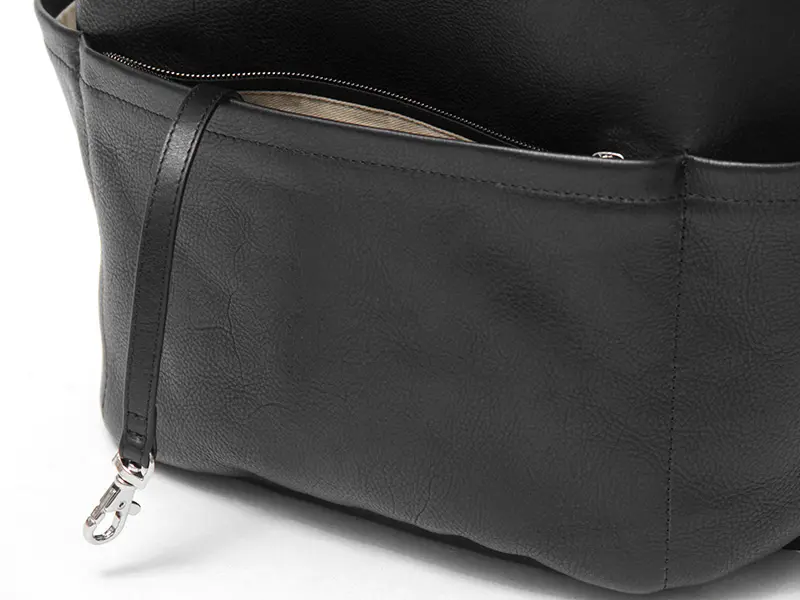 両サイドのオープンポケットは、ハンカチなどすぐに取り出したいものの収納に便利です。フロントの立体的なファスナーポケットは、長財布も収まる高い収納力。バッグ内部にはキーストラップ付きで、鍵やパスケースを繋いでおけば、バッグの中で迷子になることなくサッとアクセスできます。