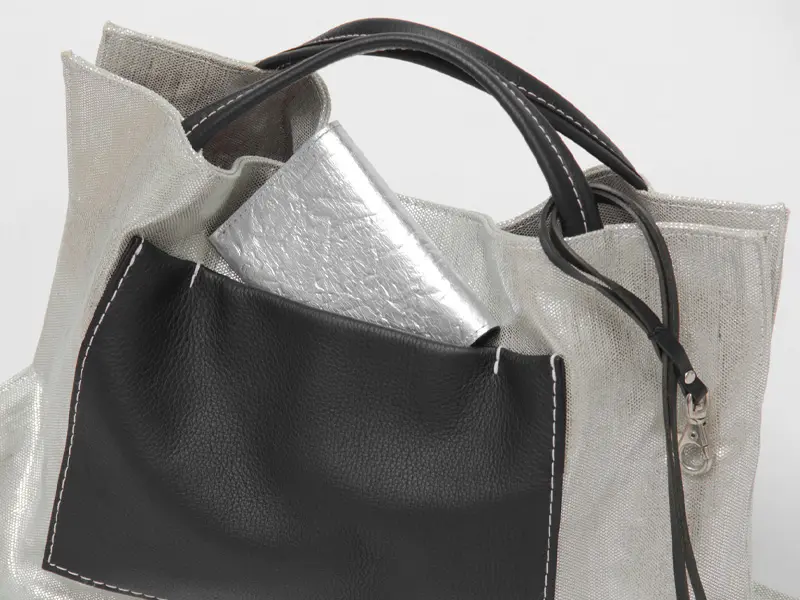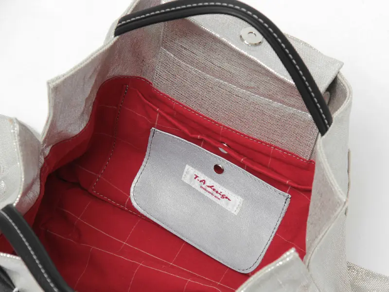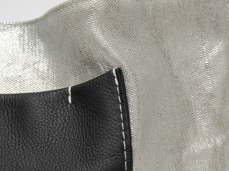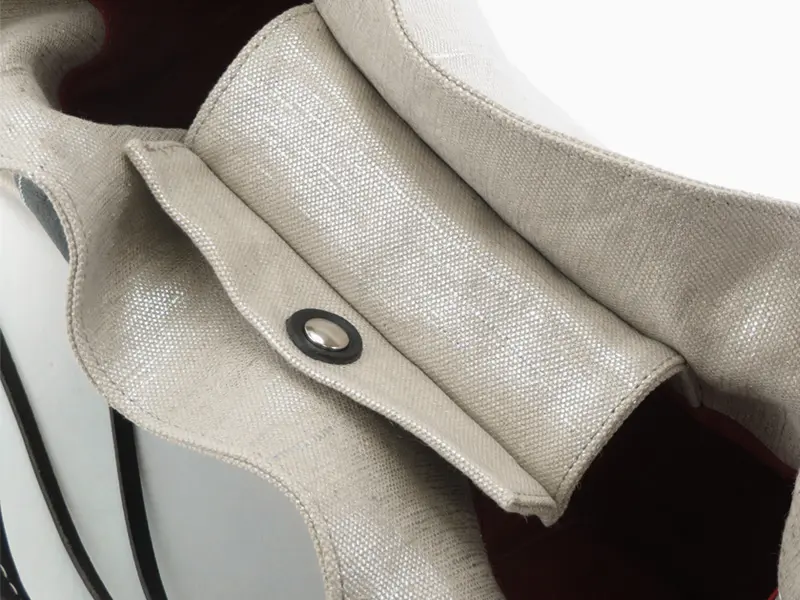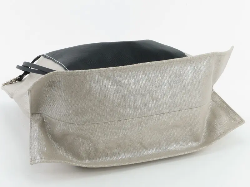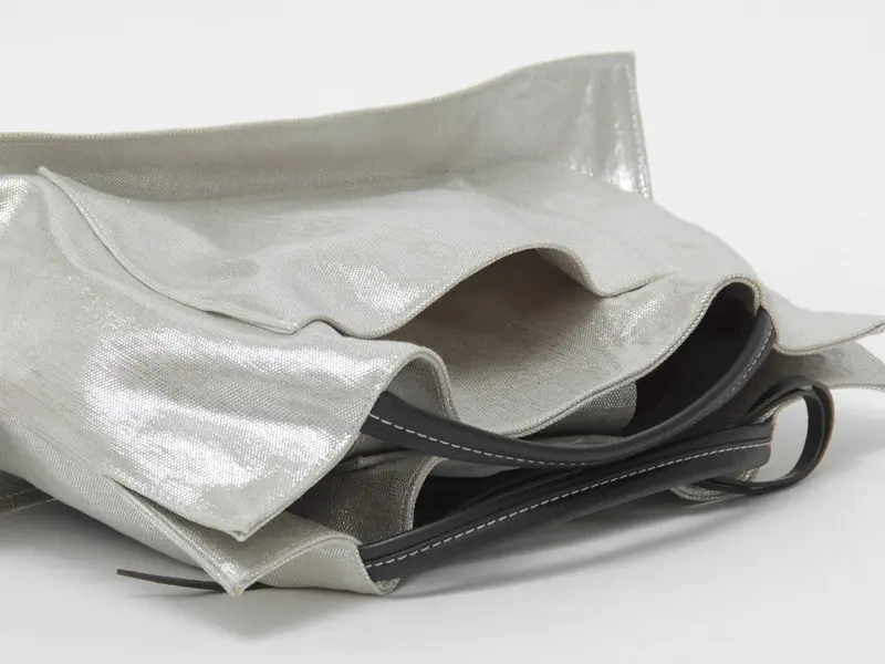 本体は、麻にメタリックな輝きを与える箔樹脂加工を施しました。天然素材の風合いを残しつつ、まるでオブジェのような上品な光沢感をプラス。見た目の華やかさに反して軽く、上質な牛革とのコントラストが際立つ、個性的な素材使いが魅力です。