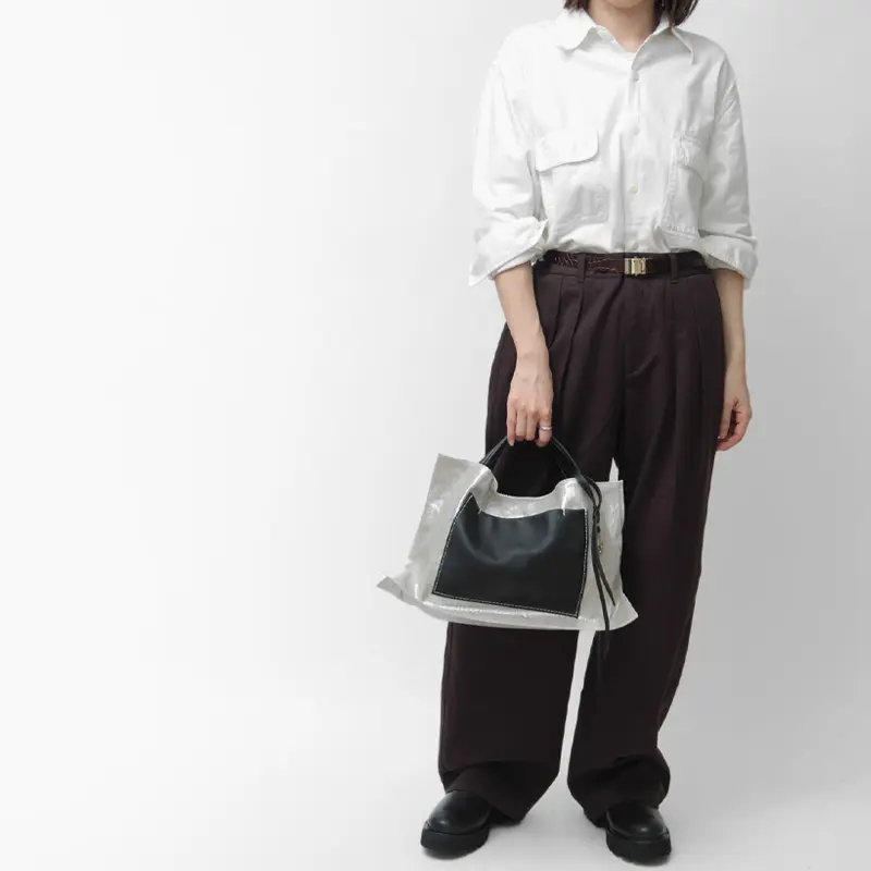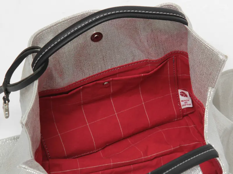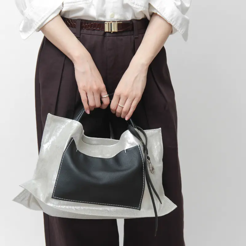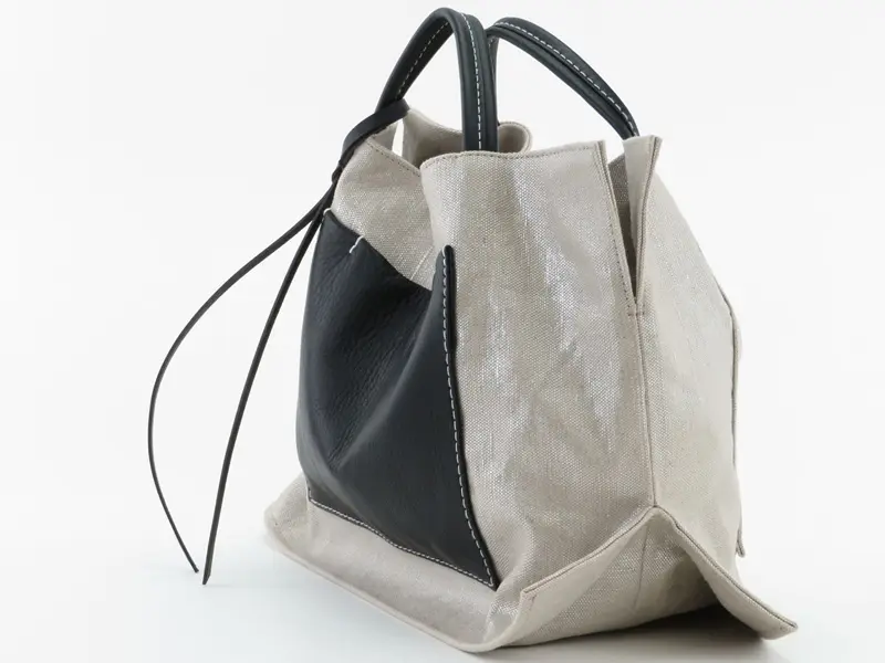 光沢を纏うリネンと、シュリンクレザー(牛革)を組み合わせた異素材コンビのトートバッグ。高級感あるレザーがデザインを引き締め、洗練された大人のスタイルを演出します。きれいめカジュアルから通勤まで、装いに個性を添えたい女性におすすめの日本製バッグです。