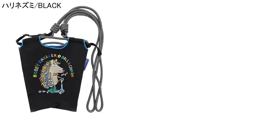 ブラック(黒)をベースに、色鮮やかなハリネズミがキックボードに乗る姿が可愛らしく、持つだけでコーディネートのアクセントになる仕上がりです。