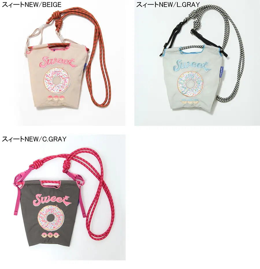 ドーナツとスウィートのロゴがキャッチーで目立つ「SWEET NEW(スィートニュー)」。ドーナッツのトッピングもアクセントになり、全体をより可愛らしく引き立てています。カラーはベージュ・ライトグレー・チャコールグレーの3色です。