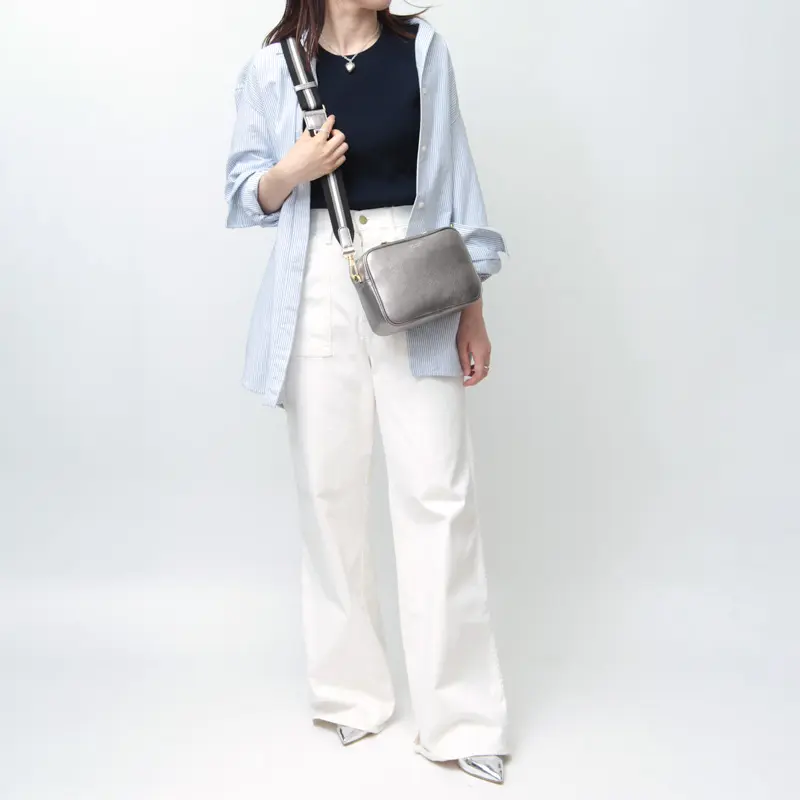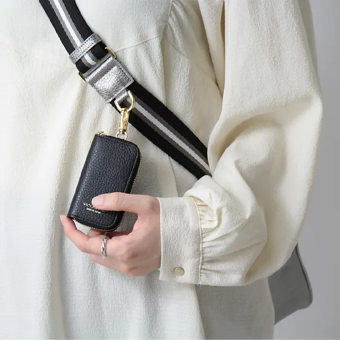 フ開閉はダブルファスナー仕様で、長財布も収まるサイズ感。スマートフォンやポーチ、エコバッグ、ハンカチなど外出時の必需品を無理なく収納できます。大きすぎず小さすぎないバランスの良いサイズで、使い勝手の良さが魅力。内ポケット付きで、ICカードや鍵などの小物整理もスムーズです。