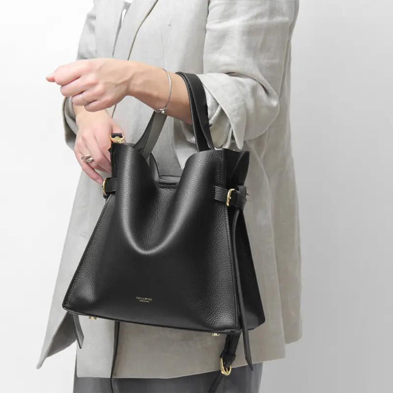 柔らかさのあるレザーを活かした、程よいボリューム感のトートバッグ。着脱できるショルダーストラップ付きで、ハンドバッグから斜め掛けまで幅広く対応します。両手を自由に使えるクロスボディスタイルは、アクティブなシーンにもおすすめです。