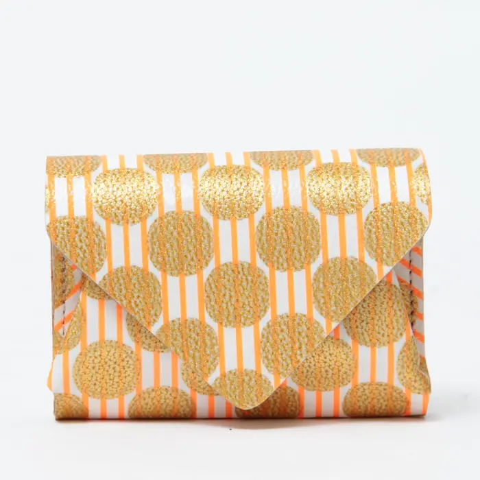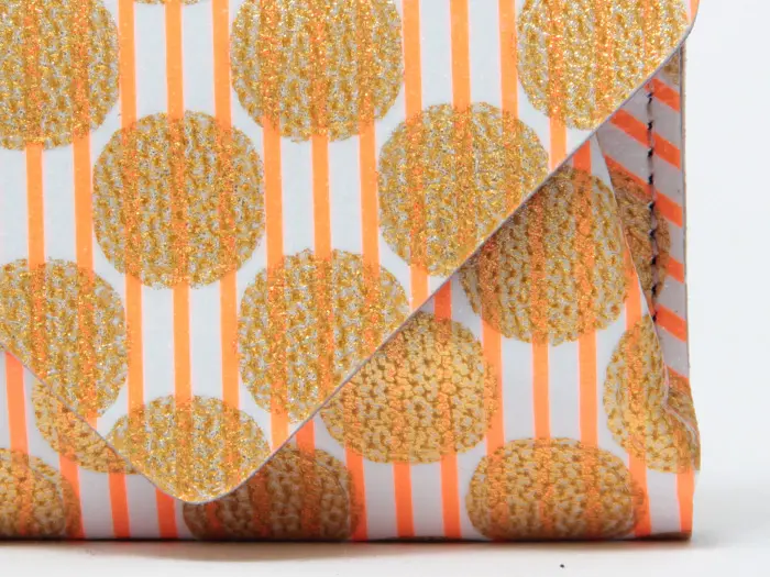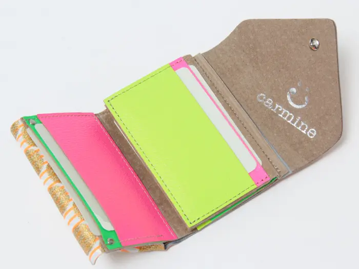 ネオンオレンジのラインとゴールドのアクセントが映えるデザインで、他にはない存在感を放ちます。持つだけで気分が上がる、carmineならではの個性あふれるミニ財布です。