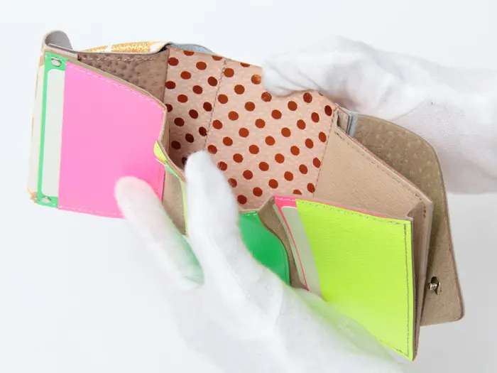 印象的な配色と柄使いが目を引く三つ折り財布は、エナメル調のコーティングを施すことで、美しさと耐久性を兼ね備えています。手のひらに収まるコンパクトなサイズ感ながら、日常使いに十分な収納力を備えた一品です。