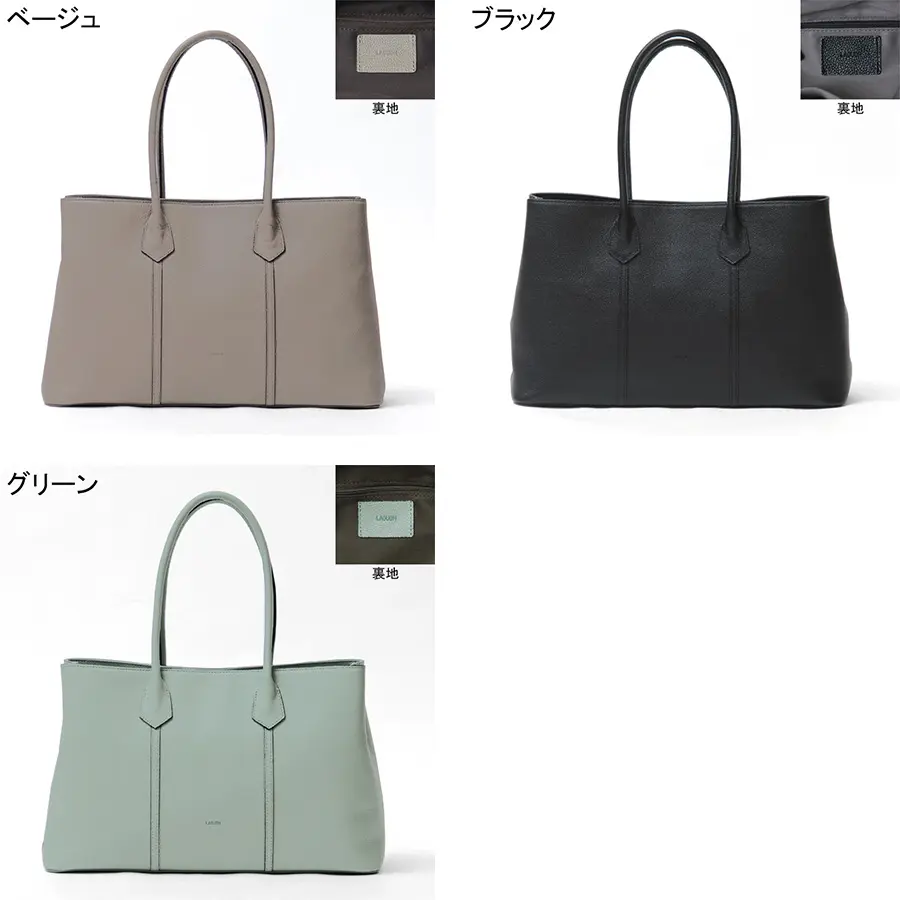ビジネスユースを想定して仕立てた、LAQUOH(ラクーオ)の本格レザートート。主張しすぎないデザインながら、持つ人の品格を引き立てる佇まいが魅力です。A4書類やノートPCをすっきり収納できるサイズ設計で、日々の仕事に必要な機能性を備えています。ベージュやライトグリーンといったやさしい色合いは、装いに軽やかさを添えつつ、かしこまりすぎない上品さでビジネススタイルにも自然に馴染みます。