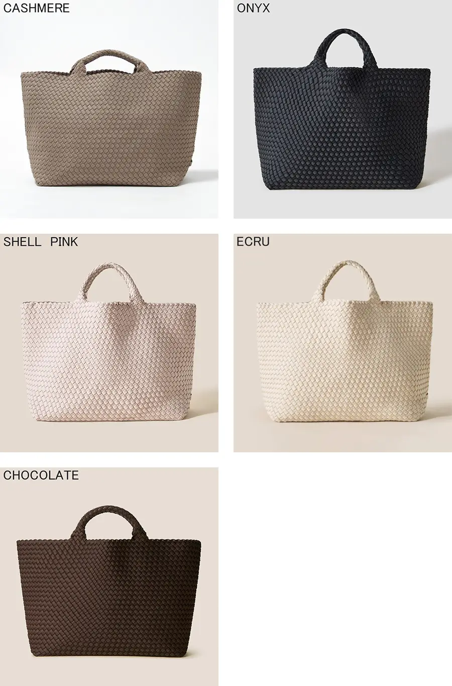 軽くて丈夫な弾力のある高密度フォーム素材を使用し、女性のライフスタイルに寄り添ったバッグを展開するNY発のバッグブランド"Naghedi/ナゲティ"。ダイビングスーツ等にも使われる機能性素材を丁寧に編み込んだメッシュ仕様のトートバッグ。B4サイズ対応のたっぷりとしたサイズ感。大容量のラージサイズは女性だけでなく、男性でもお持ちいただけるサイズ感です。お仕事バッグにはもちろん、旅行バッグやジム通いにもお使いいただけます。