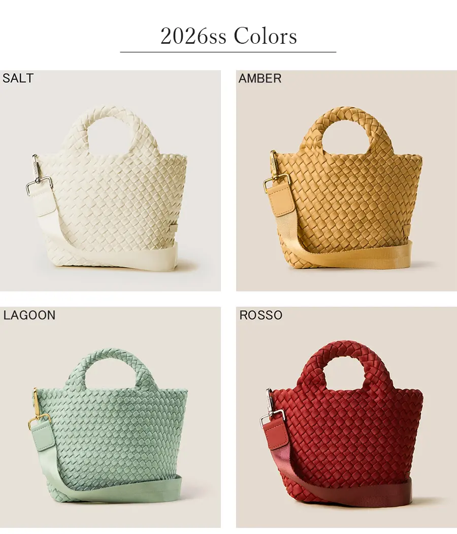 軽くて丈夫な弾力のある高密度フォーム素材を使用し、女性のライフスタイルに寄り添ったバッグを展開するNY発のバッグブランド"Naghedi/ナゲティ"。ダイビングスーツ等にも使われる機能性素材を丁寧に編み込んだメッシュ仕様のトートバッグ。取り外し可能なショルダーベルトを備えた2WAY仕様。長財布や必要最低限の荷物が収まりポケット感覚でお持ちいただけます。シーンやコーデを選ばないテイストは、幅広い年代にオススメです。