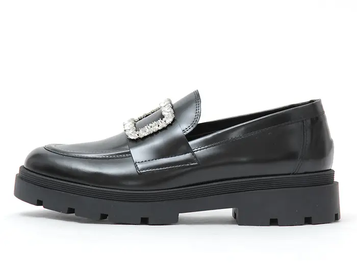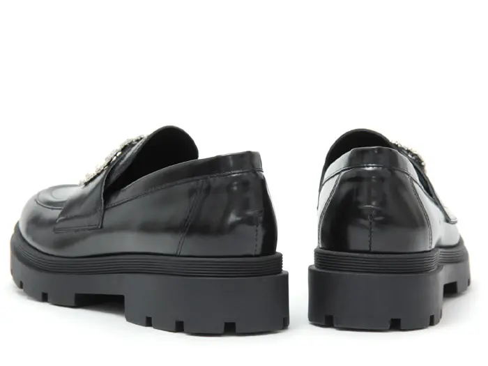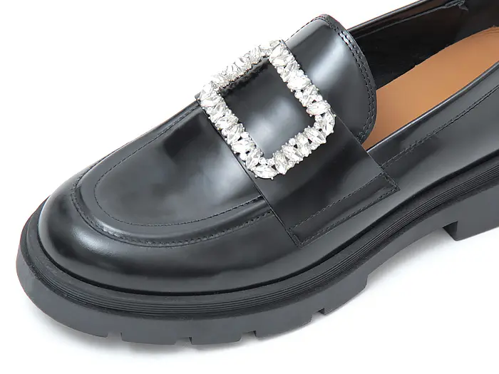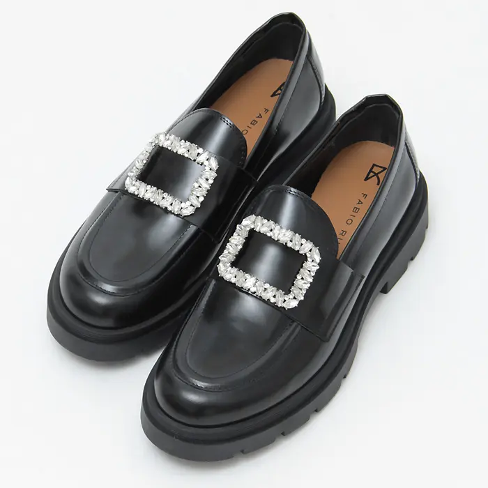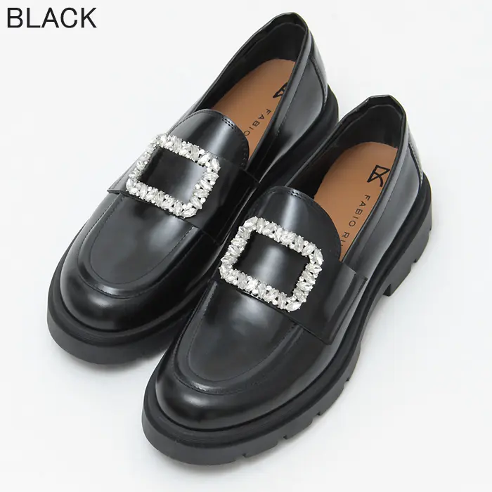 きらきら輝くビジューバックルが華やかな印象をくれる「FABIO RUSCONI(ファビオルスコーニ)」のトラックソールローファー。クラシカルなデザインと上品なブラックのガラスレザーの艶めきが、大人のコーディネートにぴったりです。厚みのあるソールが脚のラインを美しく見せてくれ、スカートやスカートとも相性が良く、レディに履ける厚底ローファーです。