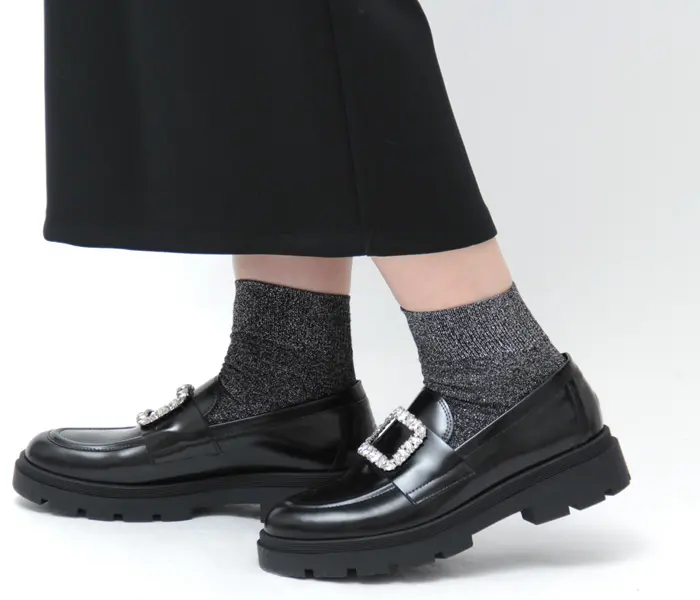 品よく履ける細身のラウンドトゥ。すっきりとしたアッパーが大人っぽく、煌めくビジューバックルが足もとに視線を集めます。