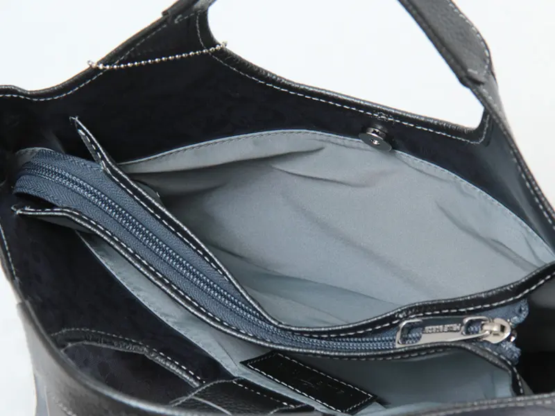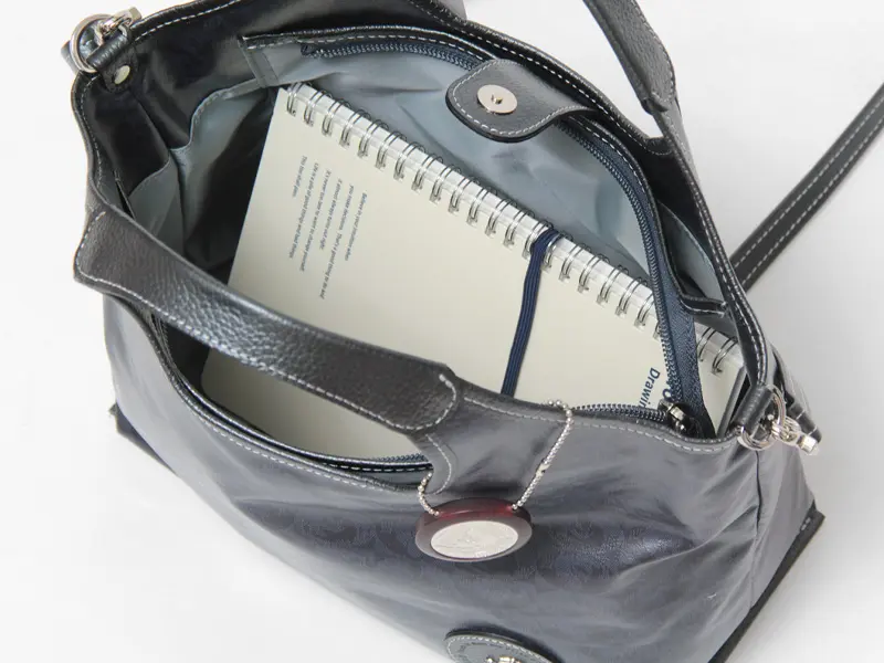 メインスペースには、A5ノートや500mlペットボトルがすっきりと収まります。 しっかりとしたマチを確保しているため、コンパクトな見た目以上に収納力があり、 長財布やコスメポーチ、ハンカチなど、日常の必需品を迷子にすることなく整理して持ち運べます。
