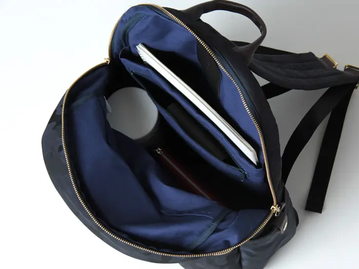 ダブルファスナー仕様で大きく開き、中身が見渡しやすい設計。A4ファイルやノート、ペットボトル、折りたたみ傘まで無理なく収納できます