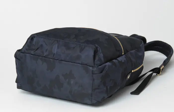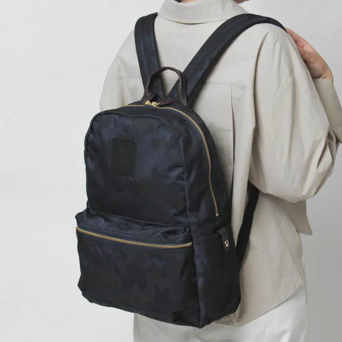 本体にはポリエステル100%のジャガード素材を使用。雨の日も気兼ねなく使える実用性と、ほんのり艶のある質感が魅力です。織りと濃淡で表現したワントーンの迷彩柄は、ミリタリー感を抑えたシックな印象。カジュアルからきれいめまで、幅広いスタイルに自然と馴染みます。