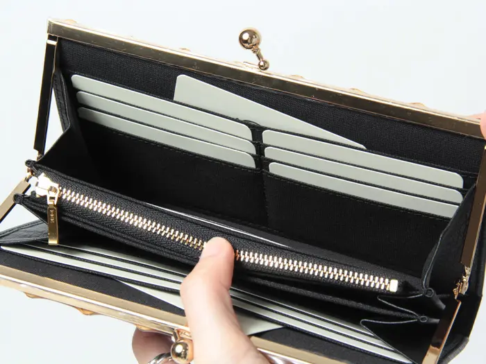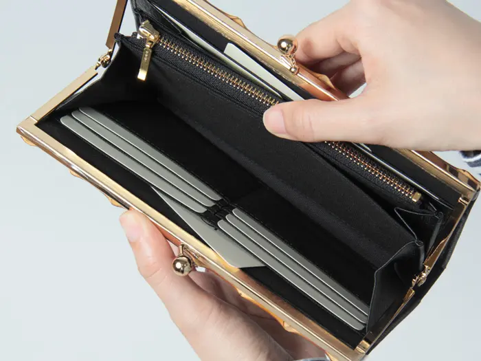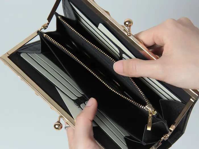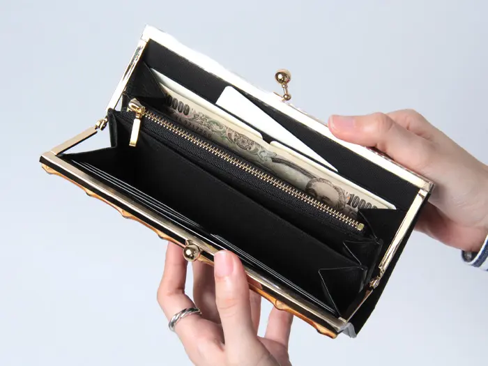 がま口を開けると中身がひと目で確認でき、会計動作もスムーズに行えます。フリーポケットも豊富に備えており、収納力に優れた使い勝手の良い財布です。