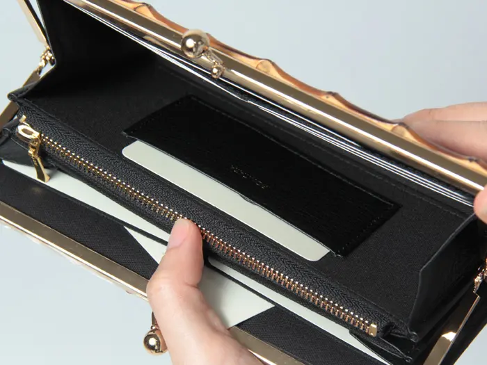 デザインのアクセントとなっているのは、深みのある焼き色のバンブーとゴールドの口金。落ち着いた大人の雰囲気と、ほどよい可愛らしさを併せ持つ、欲張りなお財布に仕上がっています。