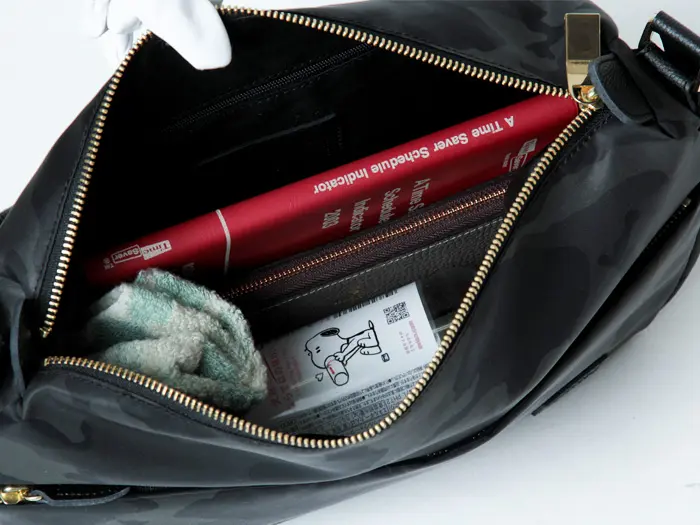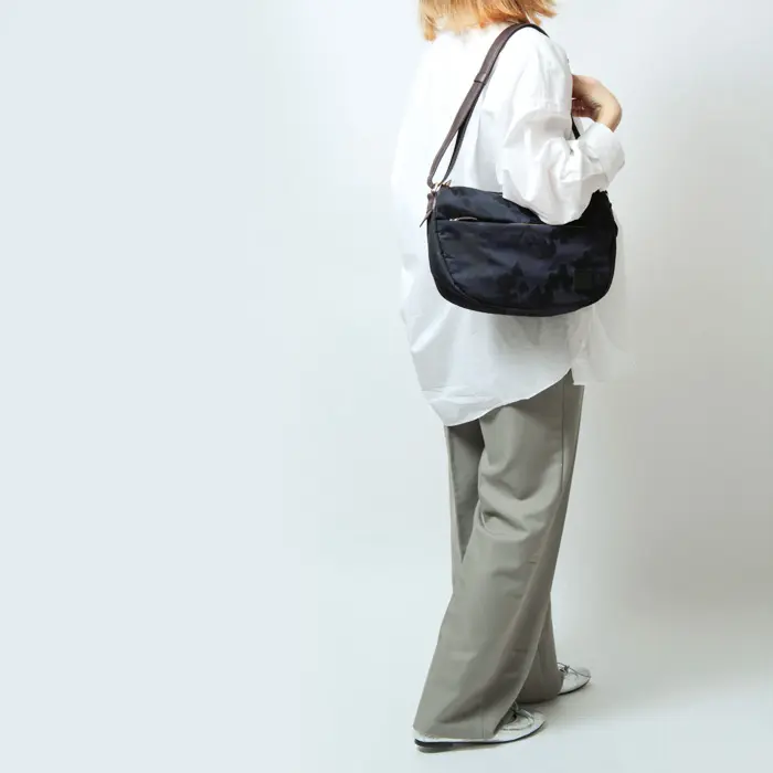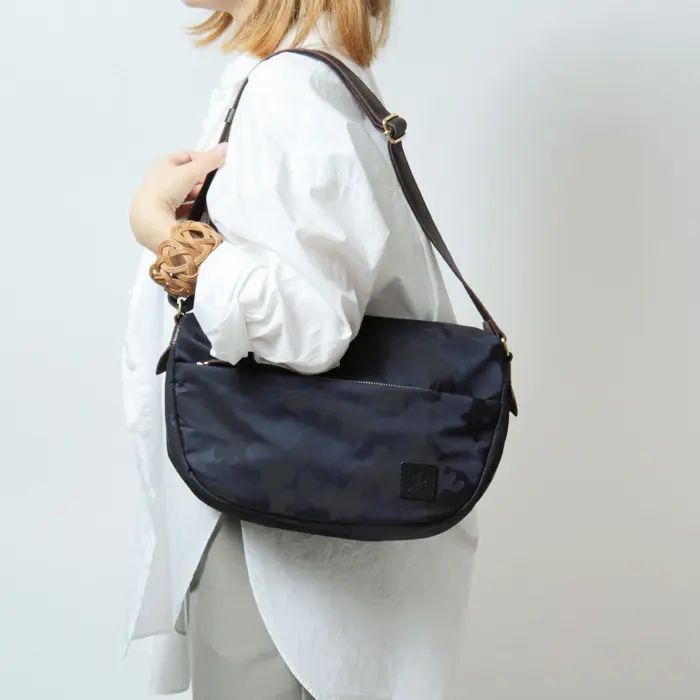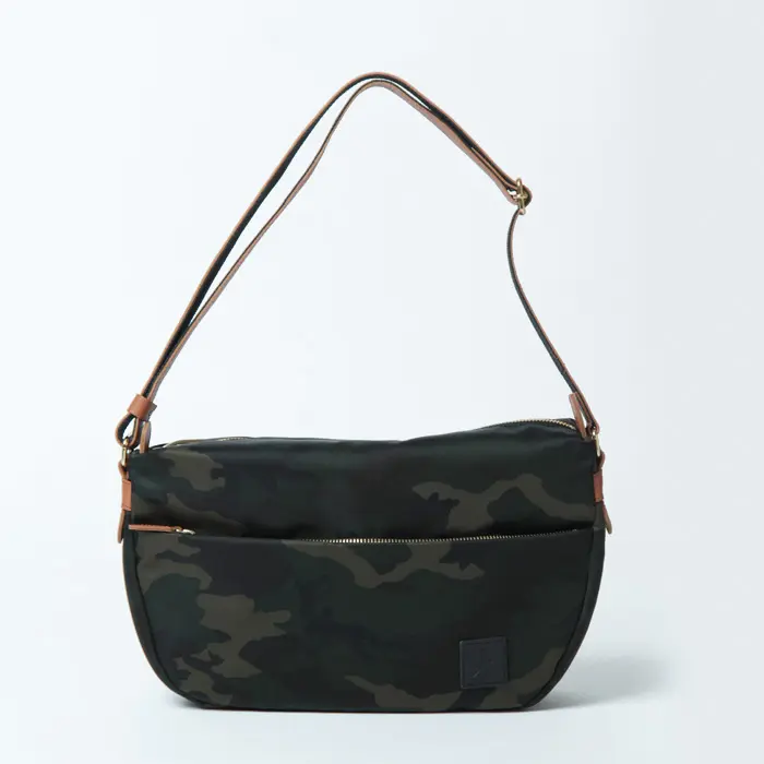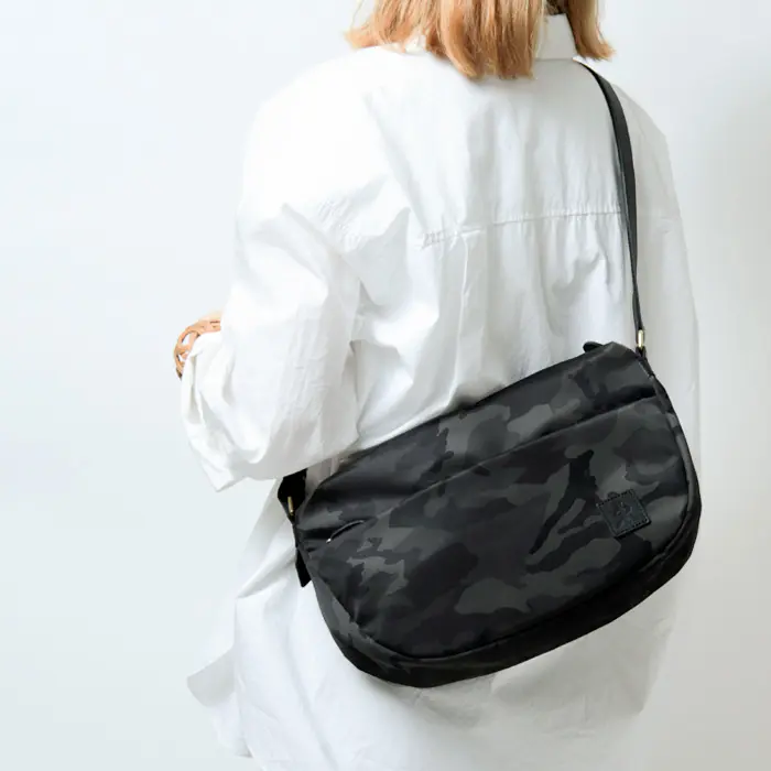控えめなカモフラージュ柄を施したナイロン素材が、大人の装いに自然と馴染むレガロ/ディマンシェシリーズのショルダーバッグ。軽量なナイロン素材で持ち運びしやすく、デイリー使いはもちろん旅行にも活躍します。レザー使いでラフになりすぎず、男女問わず使えるユニセックスなデザインも魅力です。