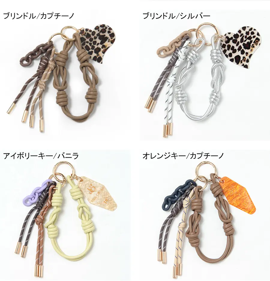 レザーコード、パラコード、プラスチックチェーン、そしてロゴ入りのアクリルパーツ。 厳選された4種類の素材が絶妙なバランスでセットされています。 驚くほど軽量な作りで、バッグのシルエットを崩さずに軽やかな彩りを添えてくれます。