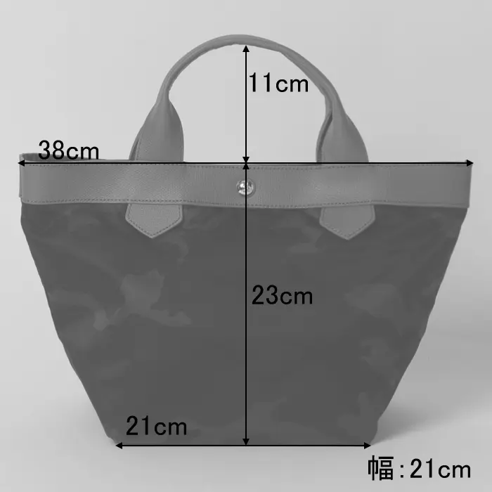 本体にはカモフラージュ柄のナイロン素材を使用。ネイビーはジャカード織りで、ほんのり立体感のある仕上がりです。ポリエステル100%で雨の日も気兼ねなく使え、上品な光沢感がシックな印象を演出。型押し牛革の持ち手が、全体を大人らしく引き締めます。