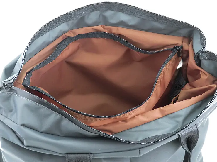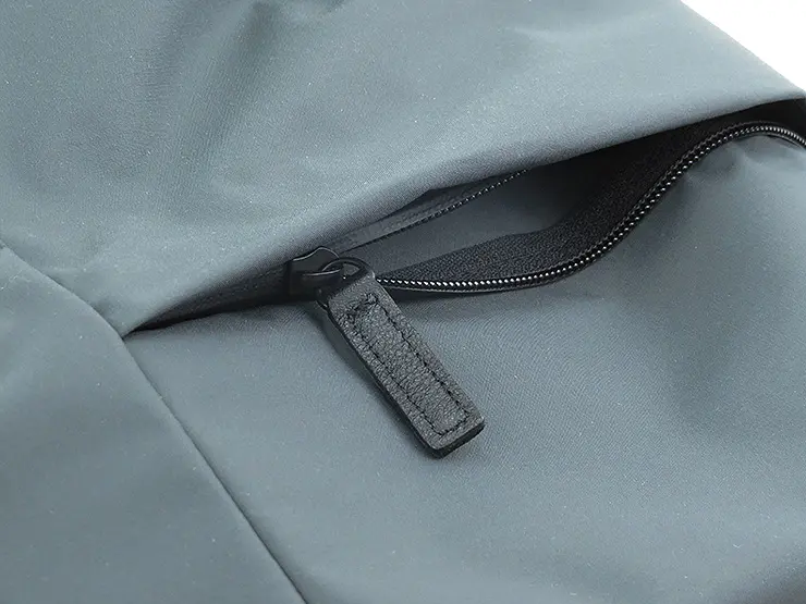 裏地には軽量なナイロンツイル素材を採用し、内部にこもりやすい湿気を外へ放散。 外側のファスナーはすべて止水ファスナー仕様で、ポケット内部への水の侵入も防ぎます。 雨の日でも安心して使える、高機能な仕上がりです。
