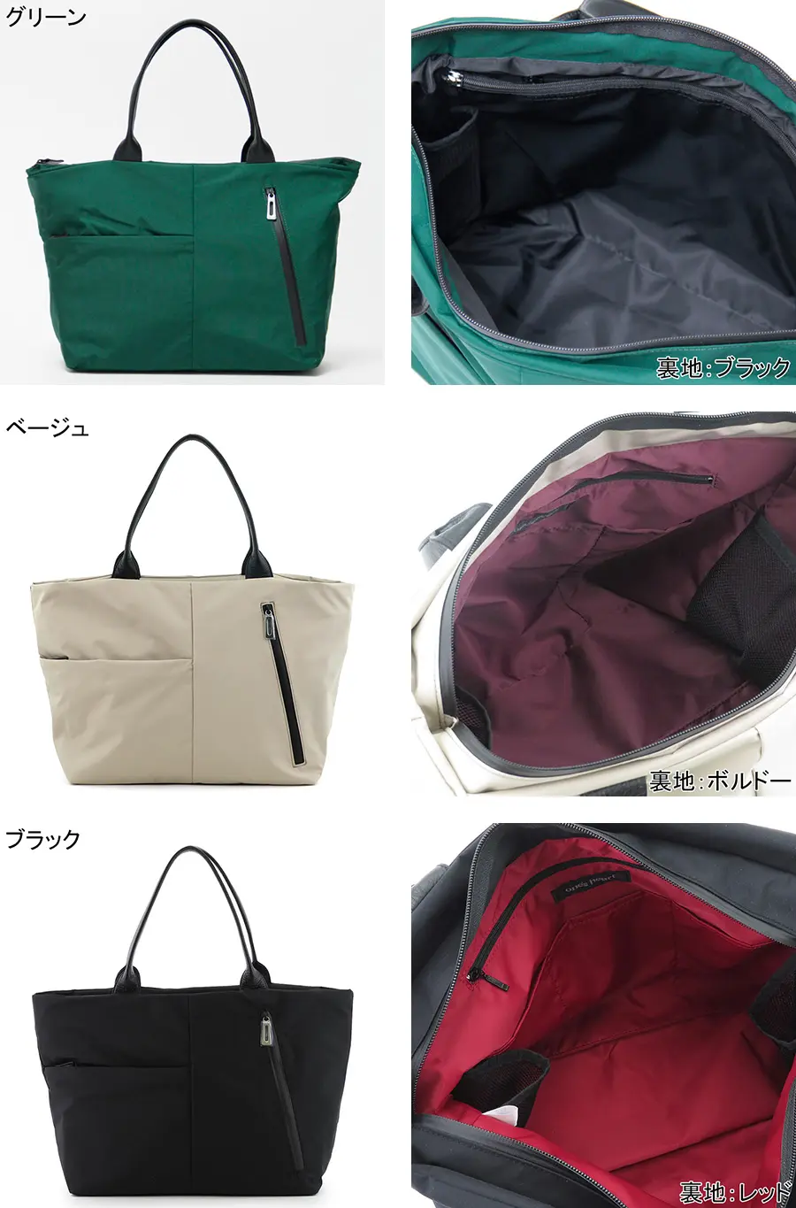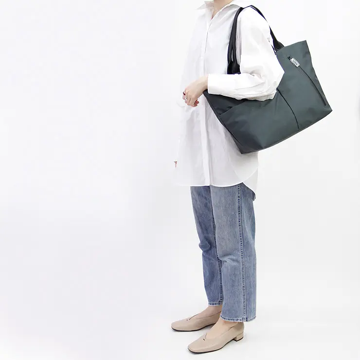 防水機能を備え、雨の日も気にせず使えるナイロントート。マットな質感が落ち着いた印象で、大人が持てる上品な仕上がりです。 約420gと軽量ながら大容量で、使い勝手も抜群。シンプルなデザインはスタイルを選ばず、男女問わず使えるユニセックス仕様。 普段使いから通勤、旅行、レジャー、マザーズバッグまで幅広く活躍します。バッグを開けたときに覗く、裏地とのコントラストもさりげないポイントです。