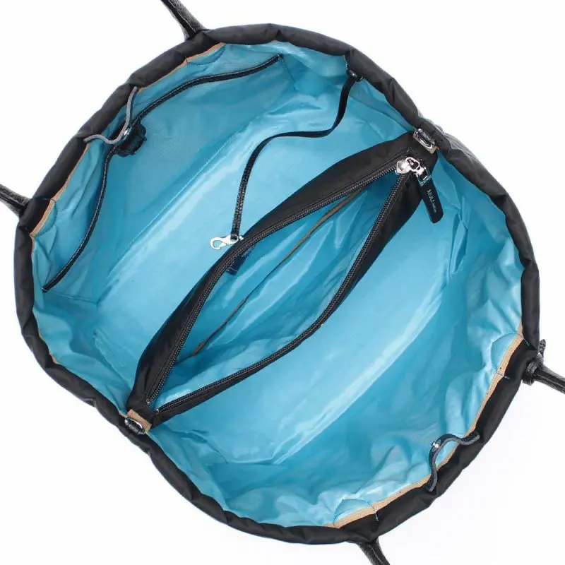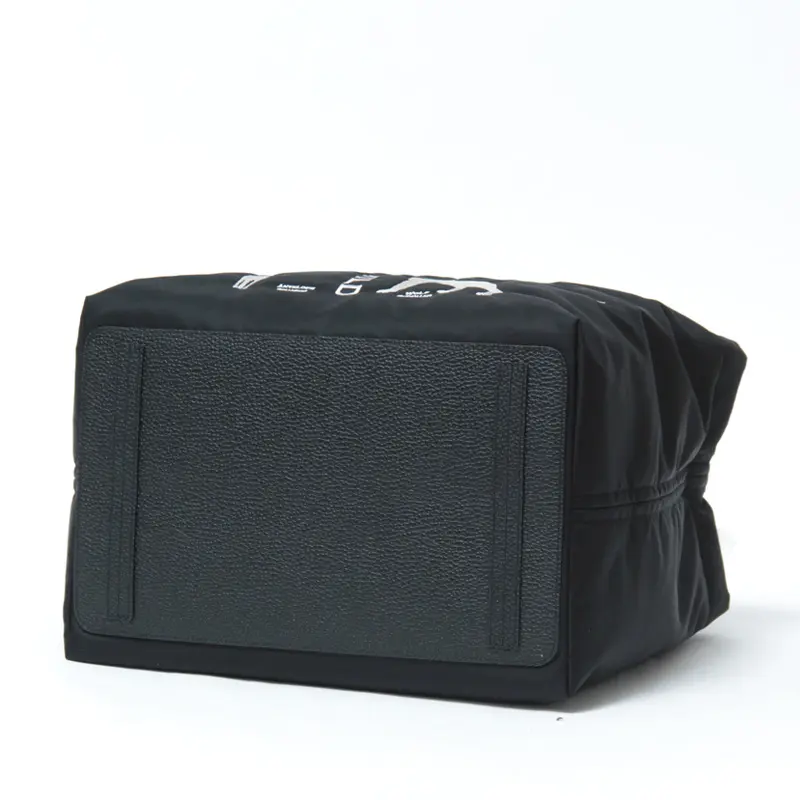ハンドルや底部には、国産牛革のシュリンク型押しレザーを使用し、ナイロン素材に品のあるアクセントを添えています。