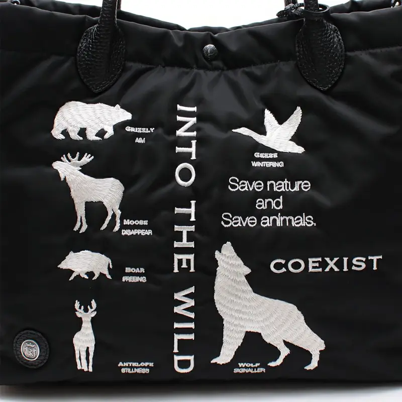 動物たちのシルエットを繊細で立体感のある刺しゅうで表現した、「ADMJ エーディーエムジェイ」のトートバッグ。「IN TO THE WILD」をテーマにしたデザインが、装いにさりげない個性を添えます。高密度ナイロンを使用し、天候を気にせず使えるのも嬉しいポイント。ハンドルや底部にはレザーを用い、カジュアルになりすぎない上品な佇まいに。A4サイズがしっかり収まり、通勤からスポーツ、レジャーまで幅広く活躍する、大人の日常に寄り添う一品です。