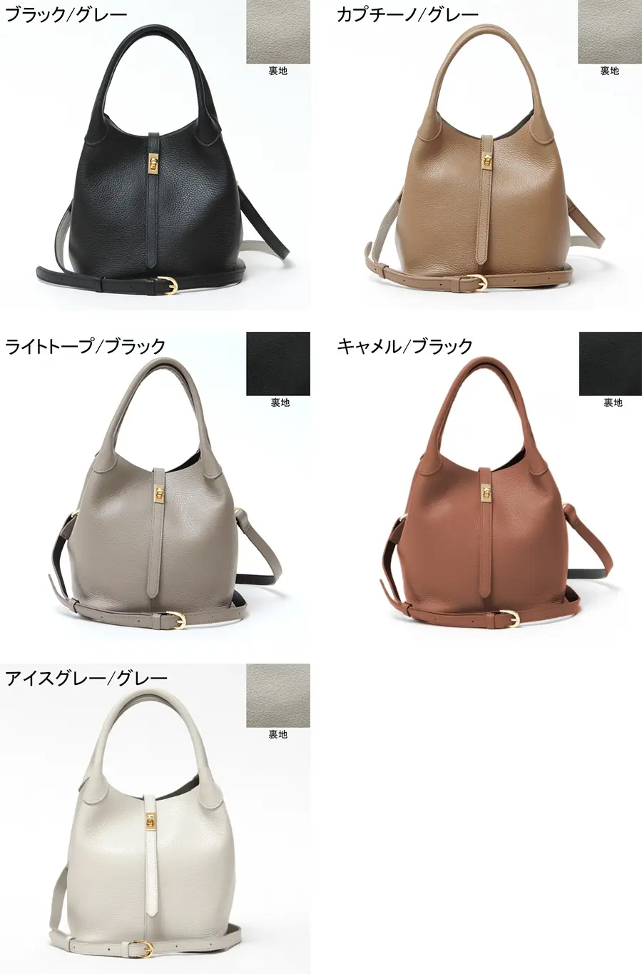 VIOLAd'oro(ヴィオラドーロ)の人気シリーズ「TRERO トレロ」から、大人の日常に寄り添うバケツ型バッグ。 フロントに配されたターンロックベルトが上品なアクセントとなり、シンプルながらも洗練されたクラス感を演出。 付属のショルダーストラップで肩掛けや斜め掛けも楽しめます。 広めのマチ設計により、長財布やペットボトルなどの必需品に加え、お出かけに必要なアイテムと+αの荷物もスマートに収納。 イタリアンWフェイスレザーを贅沢に使用した、しなやかな手触りと驚きの軽さが魅力の逸品です。