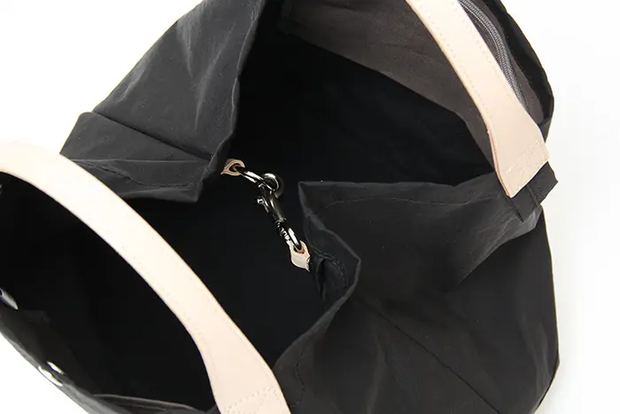 両サイドのフックを丸カンに留めることで、シルエットの変化を楽しめます。スタイルや気分に合わせて印象を変えられ、ひとつのバッグで異なる表情を演出できるのも魅力です。