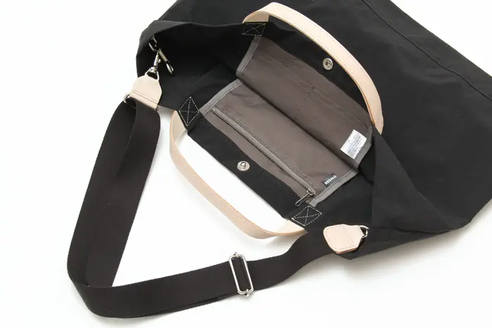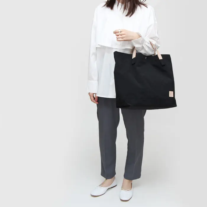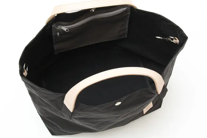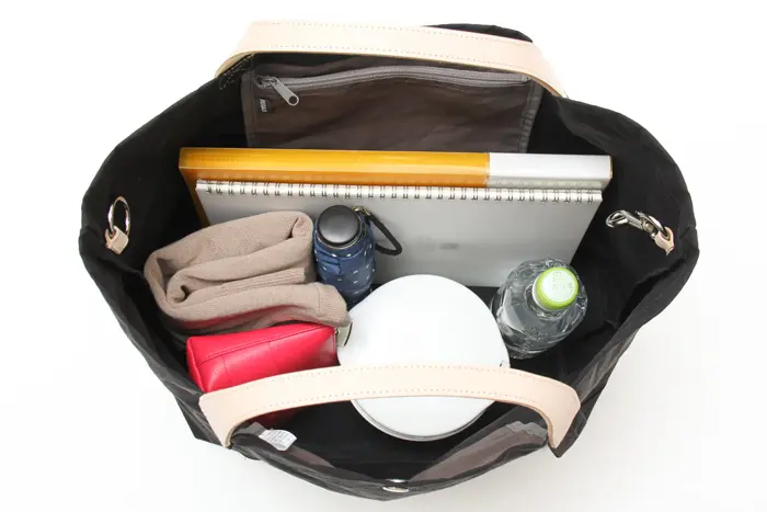 開閉はワンタッチで行えるスナップボタン仕様。A4サイズがゆったり入る大きさで、マチ幅が広く、荷物がたっぷり収まる大容量です。内ポケット付きなので、スマホやICケース、鍵などの小物が整理して収納できます。バッグ自体がとても軽いので、荷物をたくさん入れても安心です。