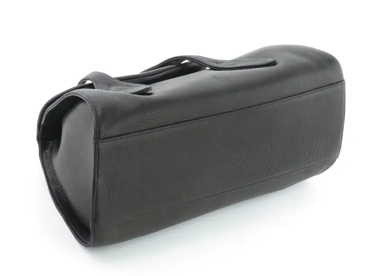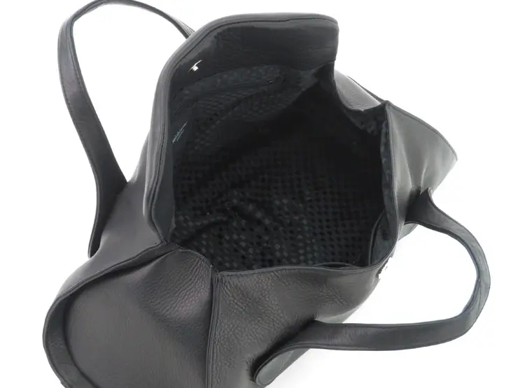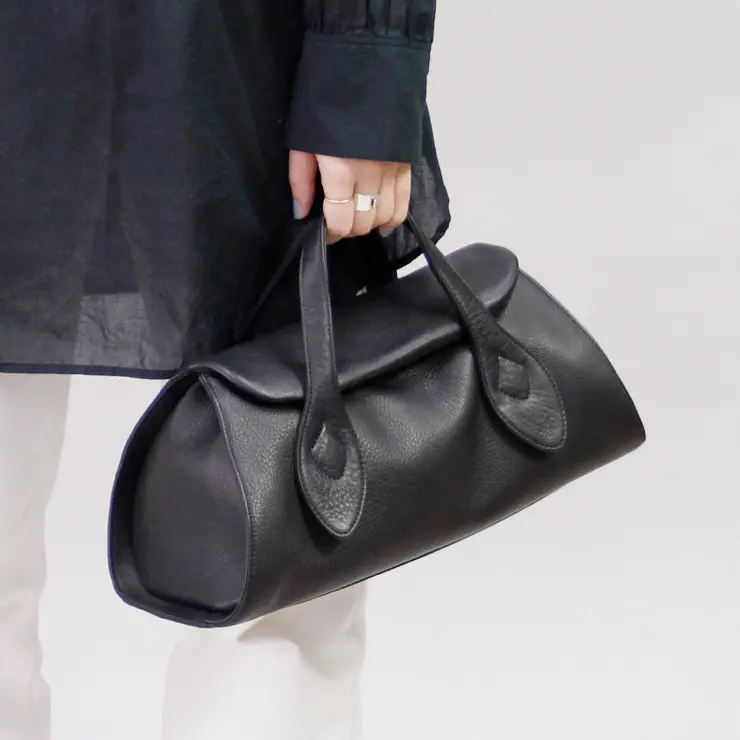 ベーシックながら少し変化を加えた個性的なシルエットが魅力のトートバッグ。さらりと持つだけでコーディネートに程よいアクセントを添えてくれます。金具の装飾を省いたオールブラックレザーのシンプルなルックスは、どんなコーディネートにも自然に馴染みます。