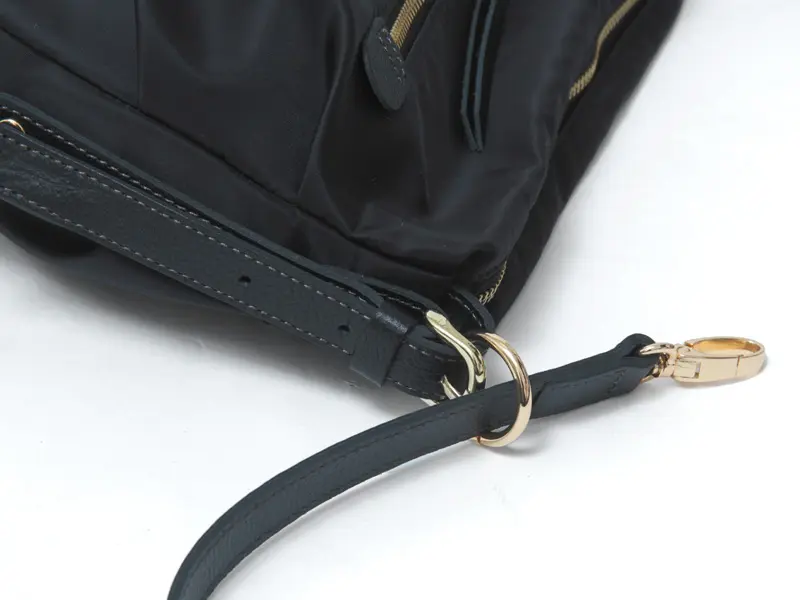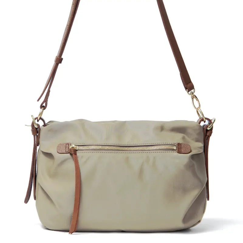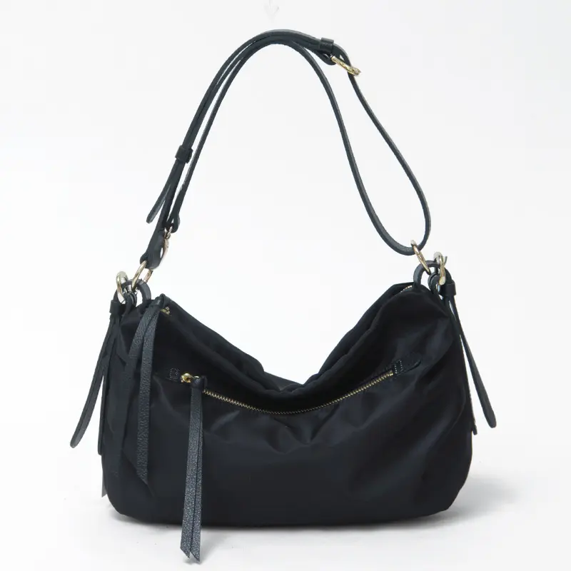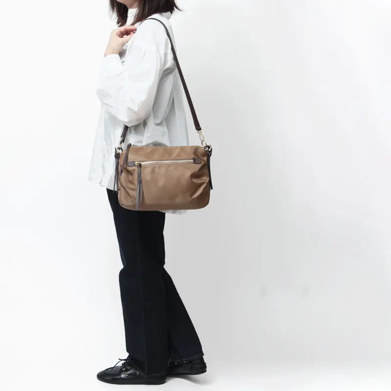 控えめな光沢感のある滑らかなナイロン素材に、レザーのラインを効かせた洗練されたデザインが魅力。シンプルな無地だからこそ、素材の美しさと上質感が際立ち、きれいめにもカジュアルにも自然に馴染みます。軽やかな持ち心地で、日常使いからお出かけまで幅広く活躍する、大人にちょうどいいナイロンバッグです。