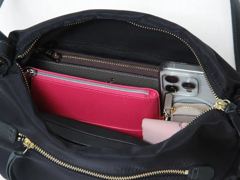 A5サイズがきれいに収納できるサイズ感で、長財布やスマートフォン、メガネケースなど外出に必要なアイテムが無理なく収まり、通勤からデイリー、旅行まで幅広く活躍する、軽やかで実用的なショルダーバッグです。バッグ自体が軽量なので、荷物が増えても負担になりにくいのもポイントです。