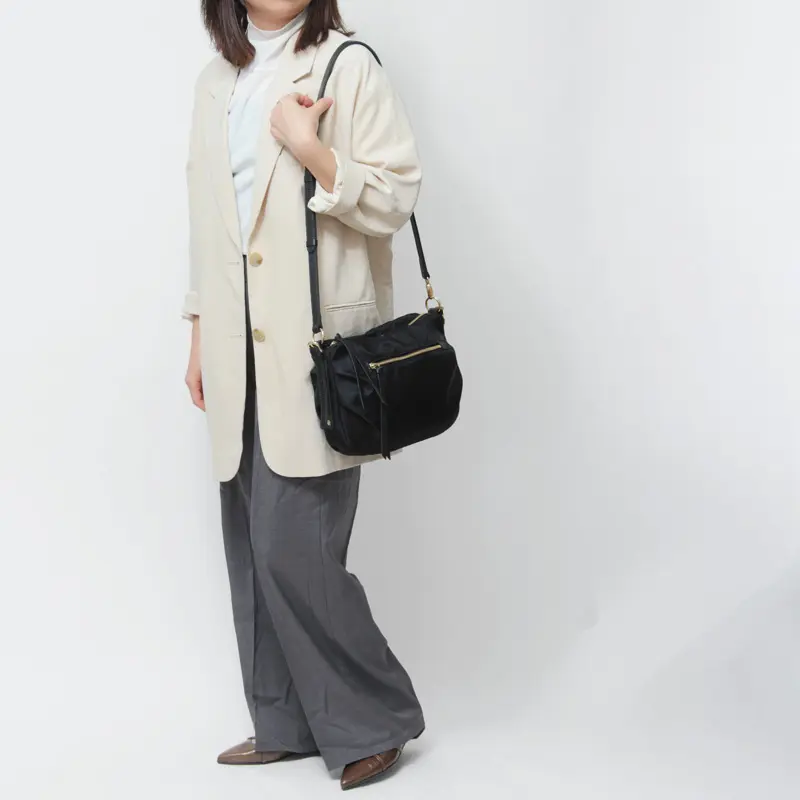 ショルダーストラップは長さ調節が可能。肩掛け・斜め掛けとシーンに合わせた使い分けができ、カジュアルにもきれいめにも対応します。軽量なので、長時間のお出かけも快適。