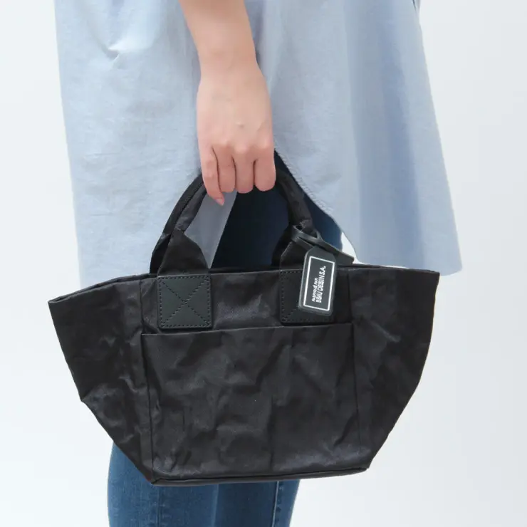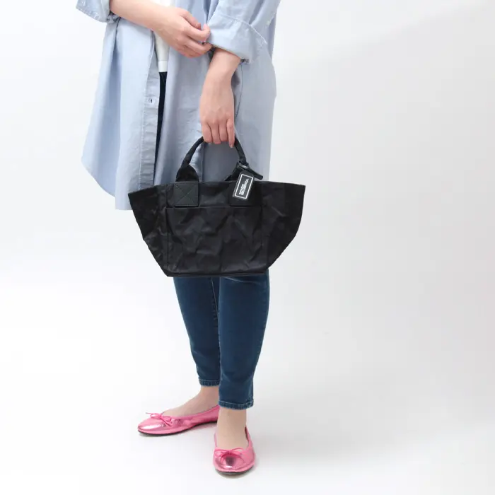 手で形を整えたり、あえてラフに扱うことで表情の変化を楽しめるのも魅力です。使い込むほどにシワが柔らかくなり、味わい深い風合いへと変化していきます。ナイロン・アルミ・裏地の三層構造で軽さと耐久性を両立し、水に濡れてもサッと拭くだけでお手入れ簡単。急な雨の日にも気兼ねなく使える素材です。