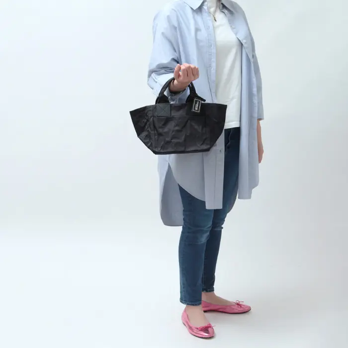 本体と同素材で仕立てたハンドルは、しっかりとした持ち心地で手持ちや腕掛けでも安定感のあるバランスに。付け根にあしらったレザーが控えめなアクセントとなり、ラフすぎない印象に仕上げています。日常使いしやすい、上品さを備えたカジュアルトートです。