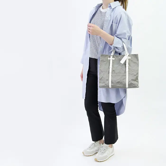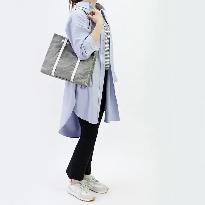 独特のシワ感と控えめな光沢が印象的な、BEAU DESSIN S.A.のアルミボンディング素材を使用したトートバッグ。ベーシックなデザインに奥行きのある素材表情が加わり、シンプルながらも存在感のある仕上がりです。A4サイズがきれいに収まる実用的なサイズ感で、きちんと感のある装いからカジュアルスタイルまで、オンオフ問わず活躍します。