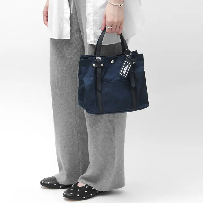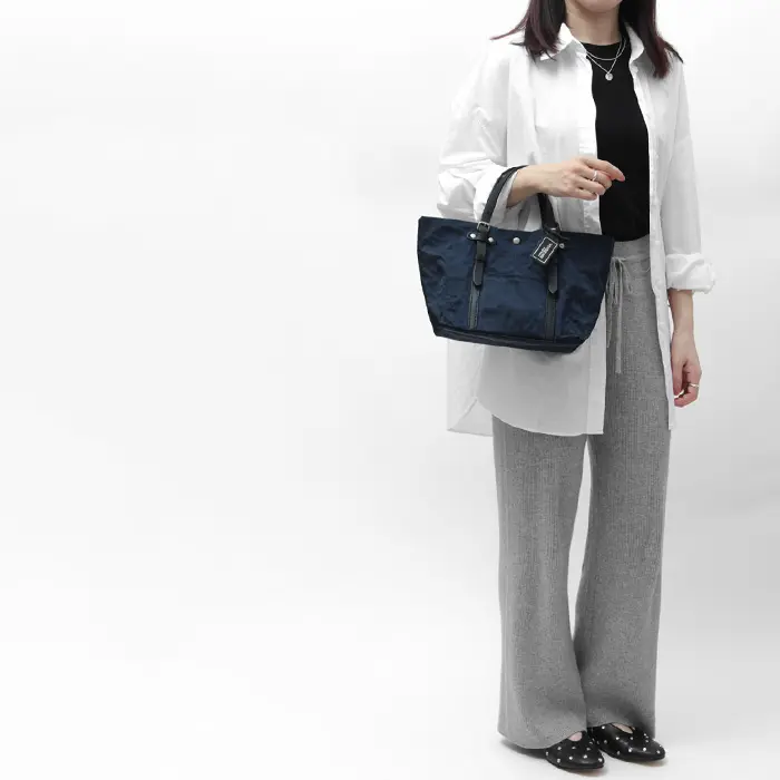 両サイドを内側に折り込むことで、台形シルエットからスクエア型へアレンジ可能。ほどよいハリ感のある素材なので形が崩れにくく、その日のスタイルや荷物に合わせた表情を楽しめます。