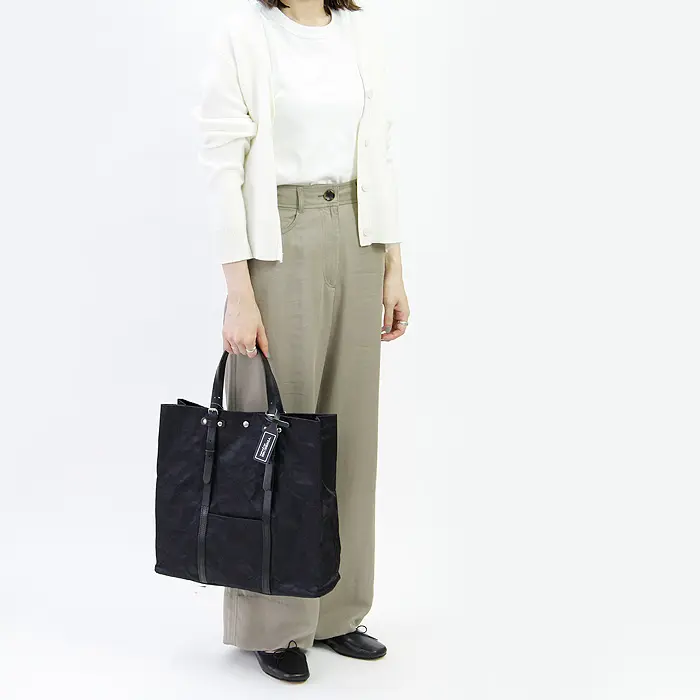 A4書類が縦横どちらでも収まる余裕のある大きさで、マチもしっかり確保。長財布やポーチはもちろん、ペットボトルや折りたたみ傘、軽い羽織りまで収納でき、荷物が多い日やお仕事用にも活躍します。軽量なので中身を入れても負担になりにくいのもポイント。