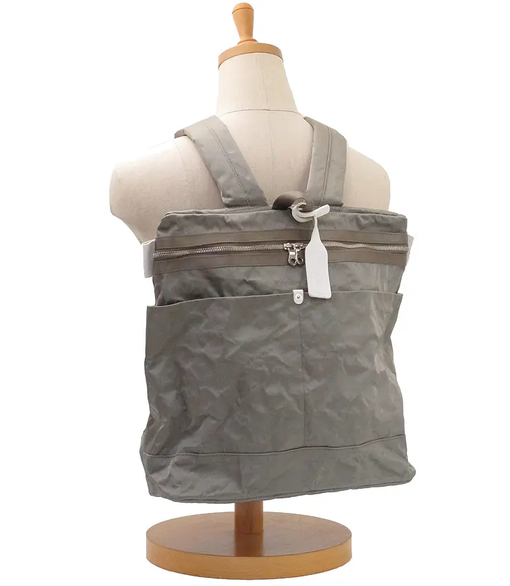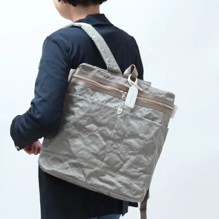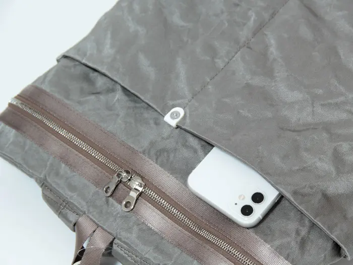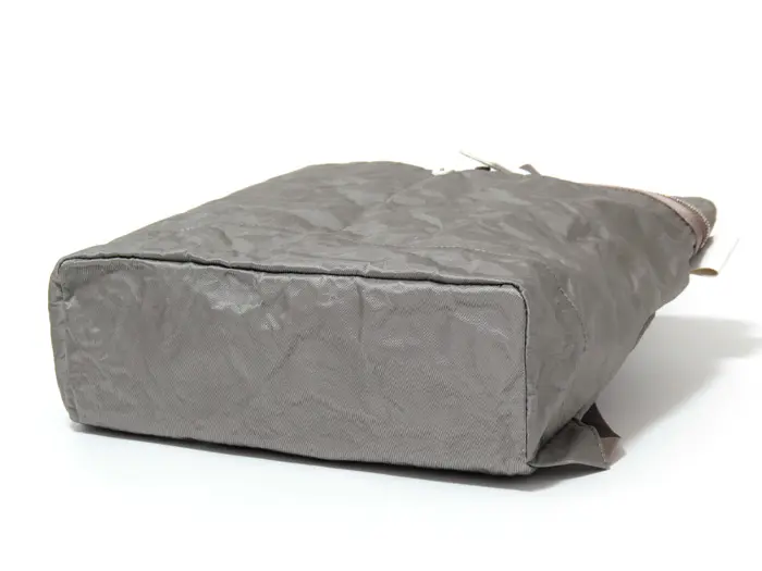 シャイニーなメタリックナイロンの裏側に薄くアルミを貼り合わせた、アルミボンディング素材を使用。ナイロンでありながら程よいハリがあり、軽く触れるだけで自然なシワ感が生まれるのが特徴です。使い込むほどにシワがやわらぎ、表情に深みが増していく経年変化も楽しめます。