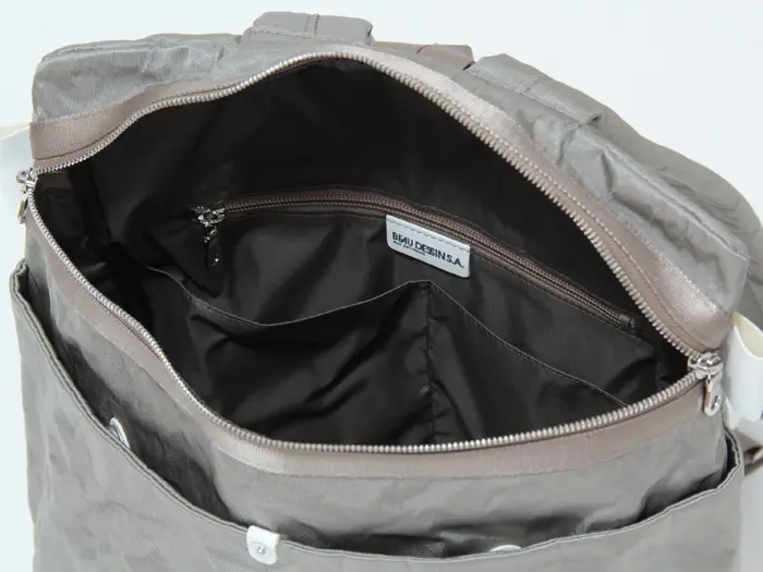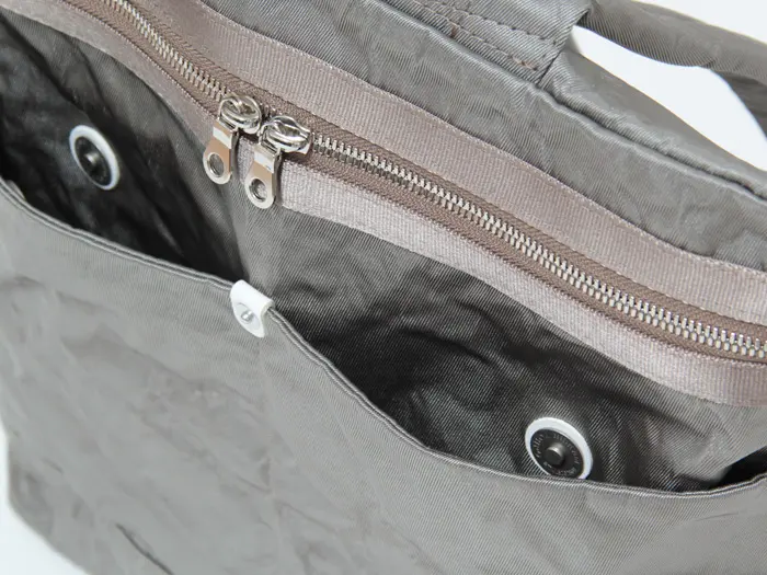 開閉はダブルファスナー仕様で、大きく開いて中身の確認や出し入れも快適。A4サイズが無理なく入る容量があり、普段の荷物もしっかり収納できます。内側にはポケットを備え、スマホやICカードなどの小物も整理しやすい設計です。