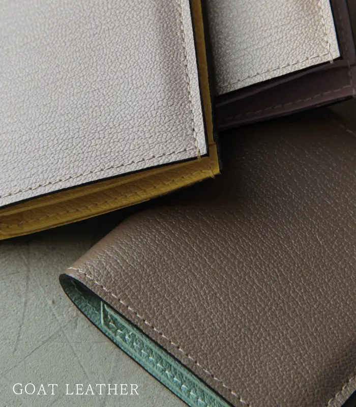 フランスの高級老舗タンナーアルラン社の美しい発色と細やかな型押しの山羊革を使用しています。繊維が細かく、軽くて、耐久性に優れた、傷のつきにくい素材で、長くご愛用いただけます。