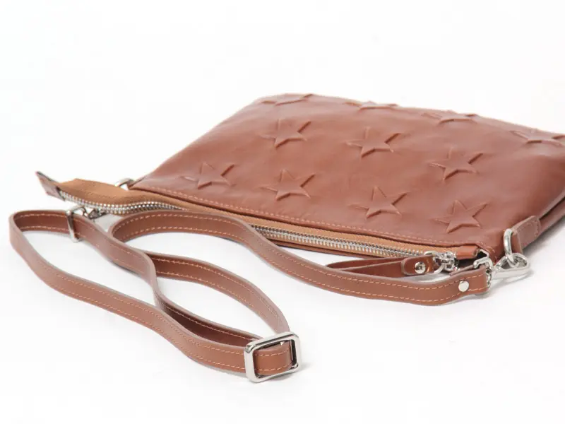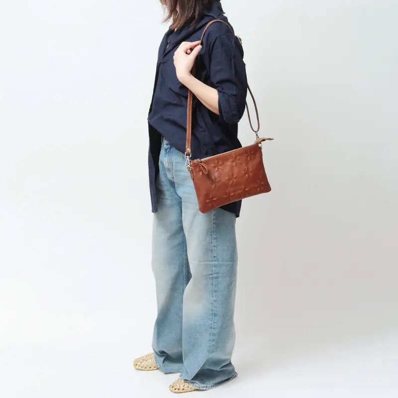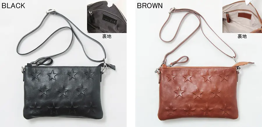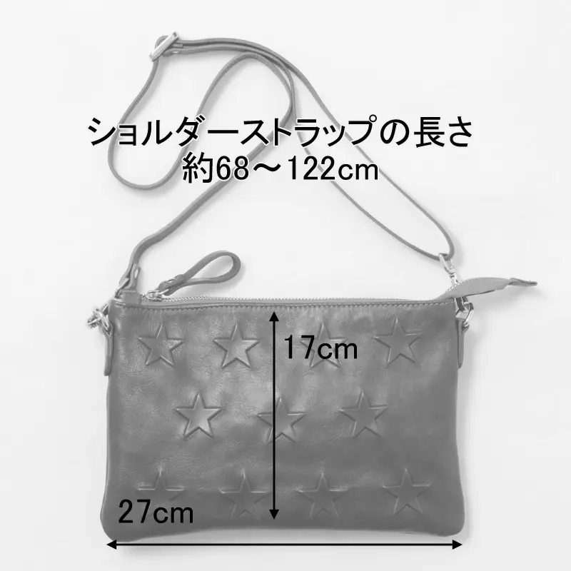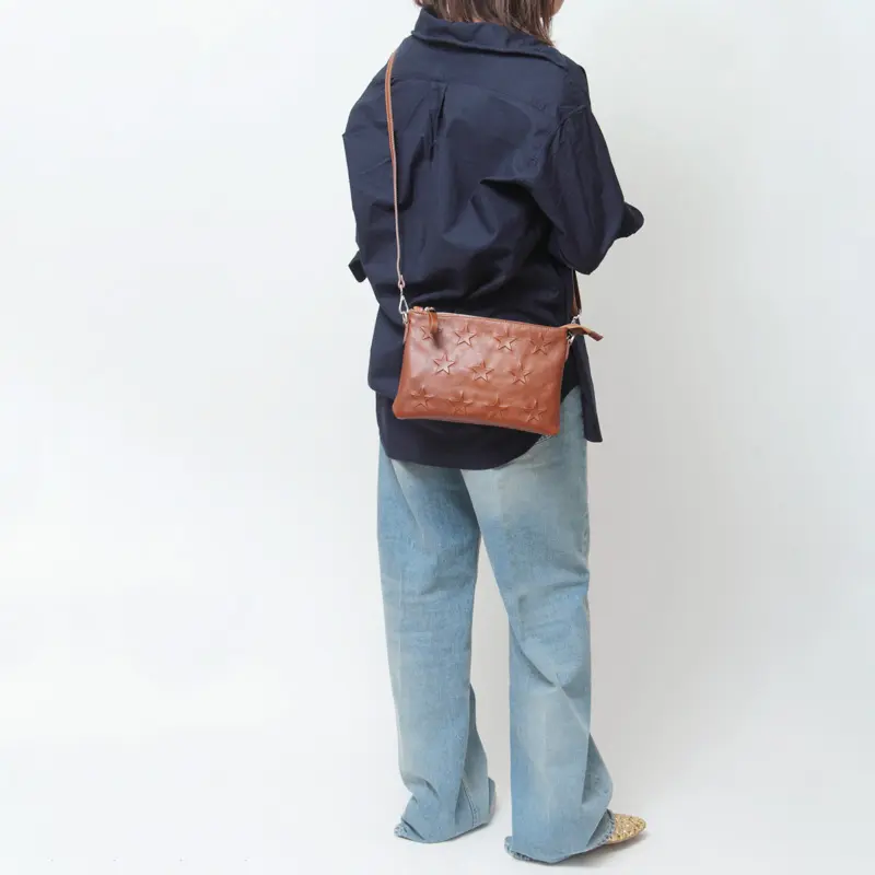 スター柄の型押しデザインが、装いにほどよい遊び心を添えます。上質なレザーの質感が、大人のカジュアルスタイルに自然と馴染み、ショルダーストラップは自由に長さ調節が可能です。