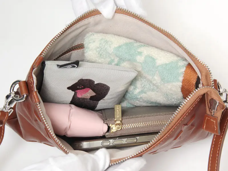 二つ折り財布やポーチ、エコバッグ、ハンカチ、スマートフォンなど、お出かけの必需品がコンパクトに収まるサイズ感。内側にはファスナーポケットを1つ備え、鍵などの小物もすっきり整理できます。