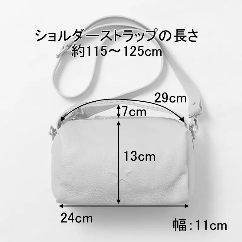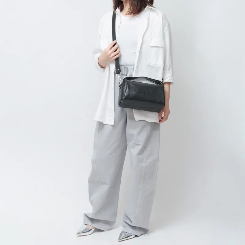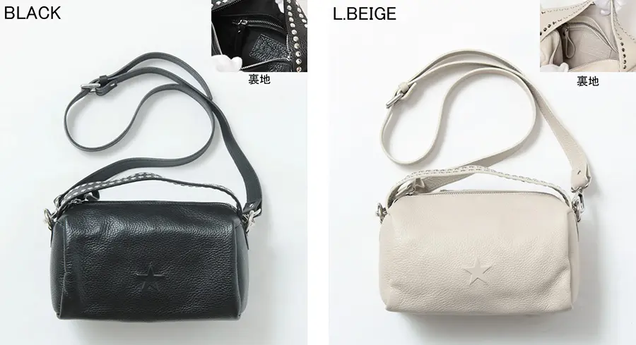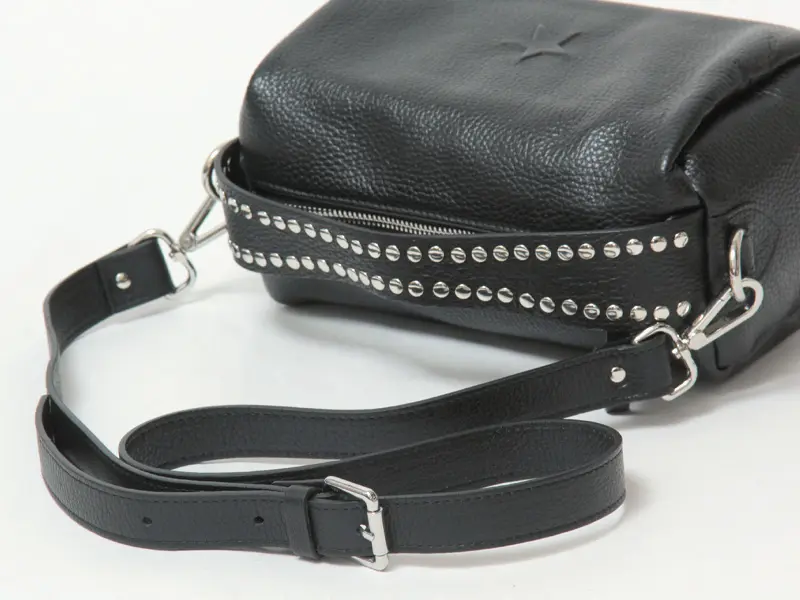スターモチーフとスタッズを組み合わせたデザインが、装いにさりげないアクセントを添えます。上質なレザーの質感が、大人のカジュアルスタイルに自然になじみます。太めに設計されたショルダーストラップは3段階で長さ調節が可能で、斜め掛けでも安定感のある掛け心地。長時間のお出かけでも快適に使えます。