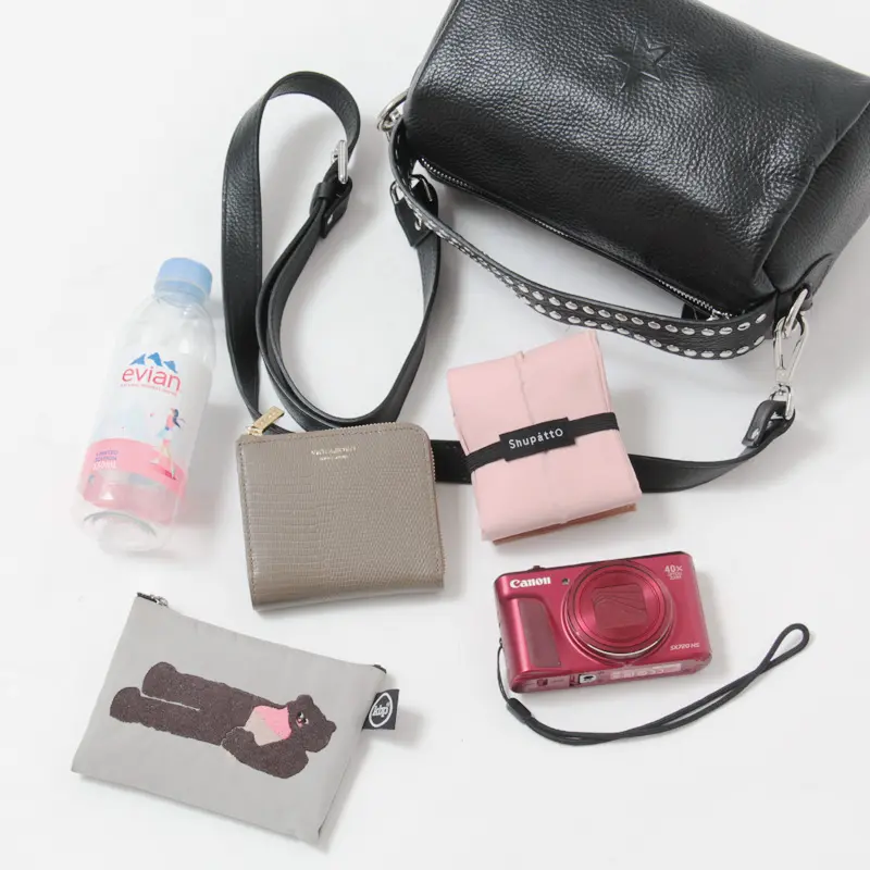 二つ折り財布、ポーチ、320mlペットボトル、エコバッグ、カメラなどが収まり、休日使いに丁度いいサイズ感。