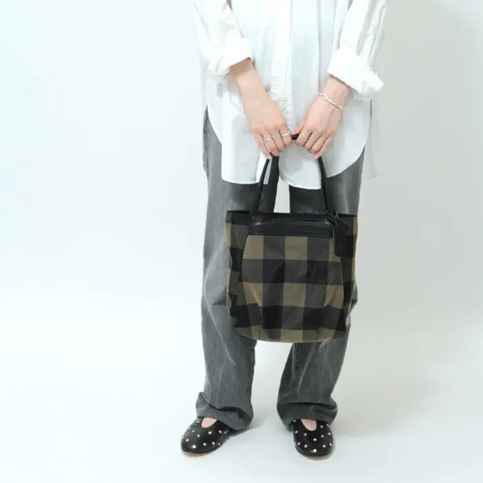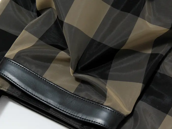 カジュアルになりがちなチェック柄を、落ち着いた配色でまとめることで大人らしい印象に仕上げています。極細の50デニールナイロン糸にポリエステルを織り込み、軽やかさと強度を両立。昔ながらの織機で丁寧に織り上げ、熱プレスを施すことで、独特の光沢とほどよい張り感を生み出しています。