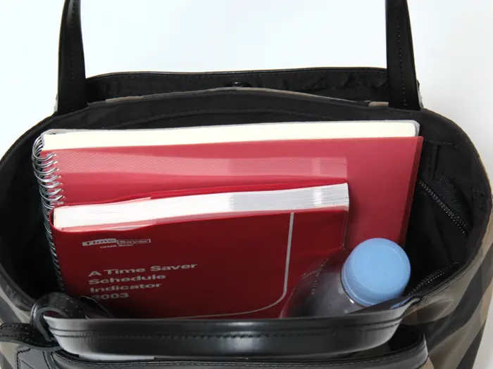 天ファスナー仕様で中身が見えにくく、安心してお使いいただけます。しっかりとしたマチがあり、長財布やペットボトルはもちろん、B5サイズのノートまで収まる実用的なサイズ感です。
