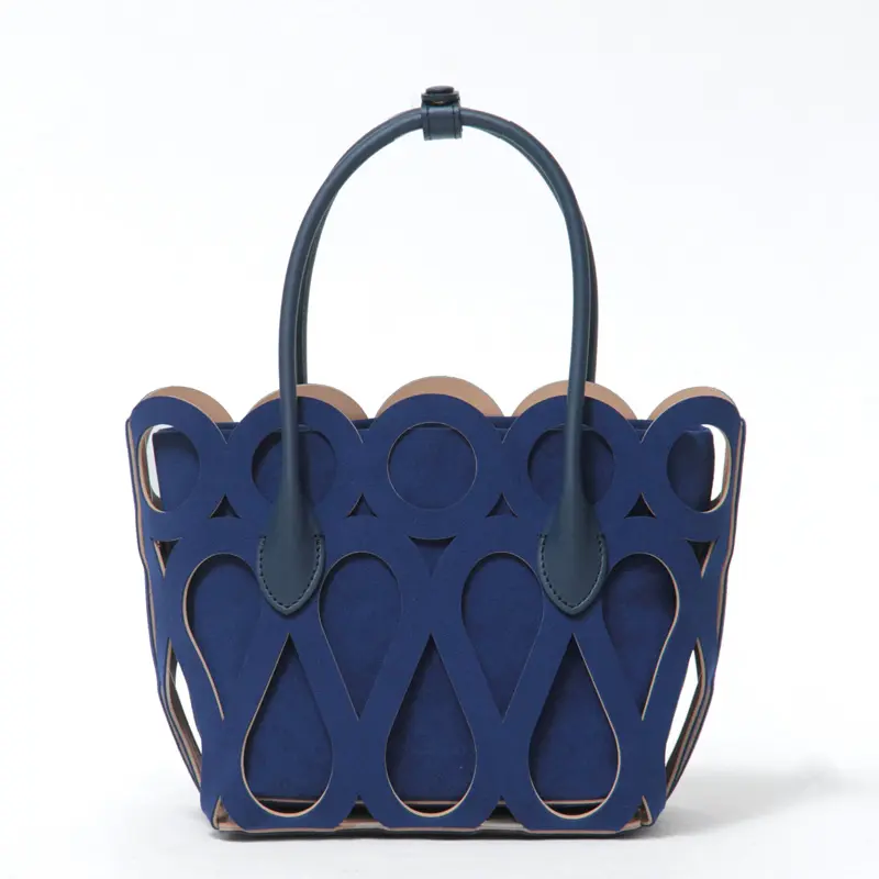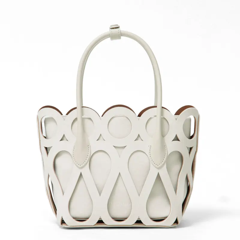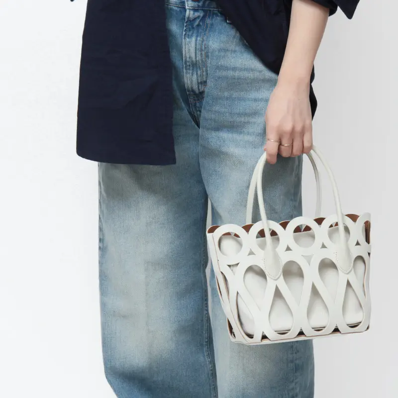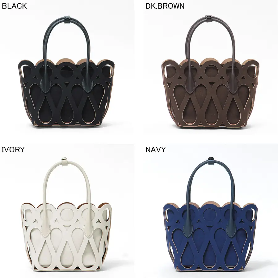 アートのようなカットワークが目を引く。少し細めのハンドルはで女性らしさをプラスし、手持ちでも肘に掛けても使いやすい絶妙な長さ。存在感のあるデザインが、いつもの装いに華やかなアクセントを添えてくれます。