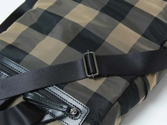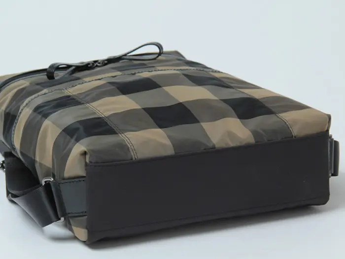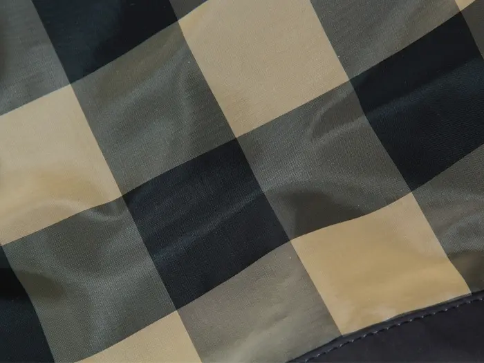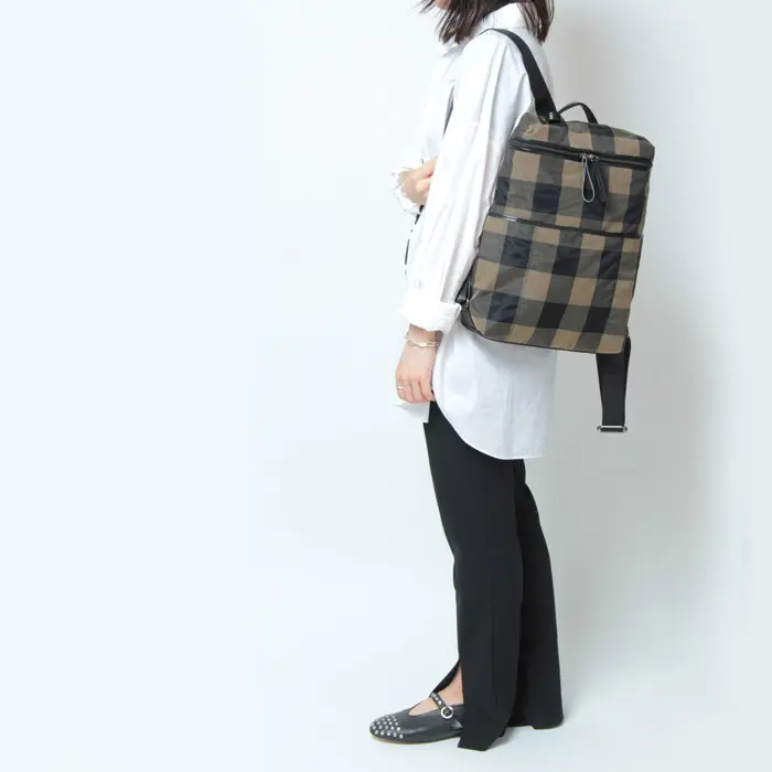 カジュアルになりがちなチェック柄を、落ち着いた配色でまとめることで大人らしい印象に仕上げています。極細の50デニールナイロン糸にポリエステルを織り込み、軽やかさと強度を両立。昔ながらの織機で丁寧に織り上げ、熱プレスを施すことで、独特の光沢とほどよい張り感を生み出しています。