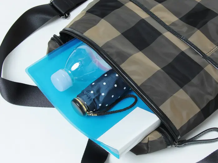 開閉はファスナー仕様。A4ファイルはもちろん、ペットボトルや折りたたみ傘も収納可能です。内側にはオープンポケット2つとファスナーポケット1つを備え、鍵やスマートフォン、リップなどの小物も整理しやすい設計です。